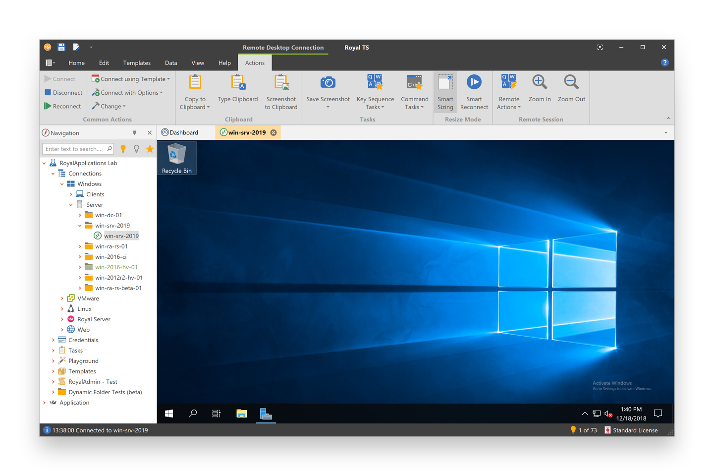 Royal TS provides the most comprehensive set of features for integrated Remote Desktop Connections (RDP) available in the industry. Plus, Royal TS provides unique management capabilities to handle terminal sessions and control Hyper-V instances.